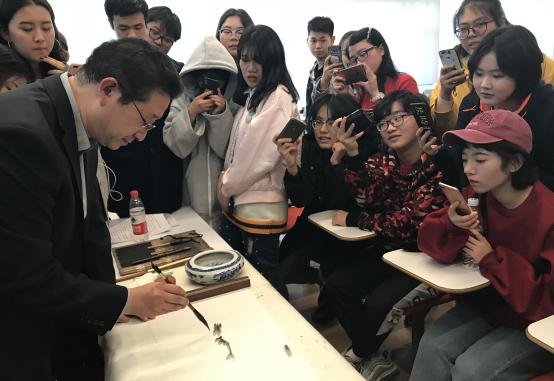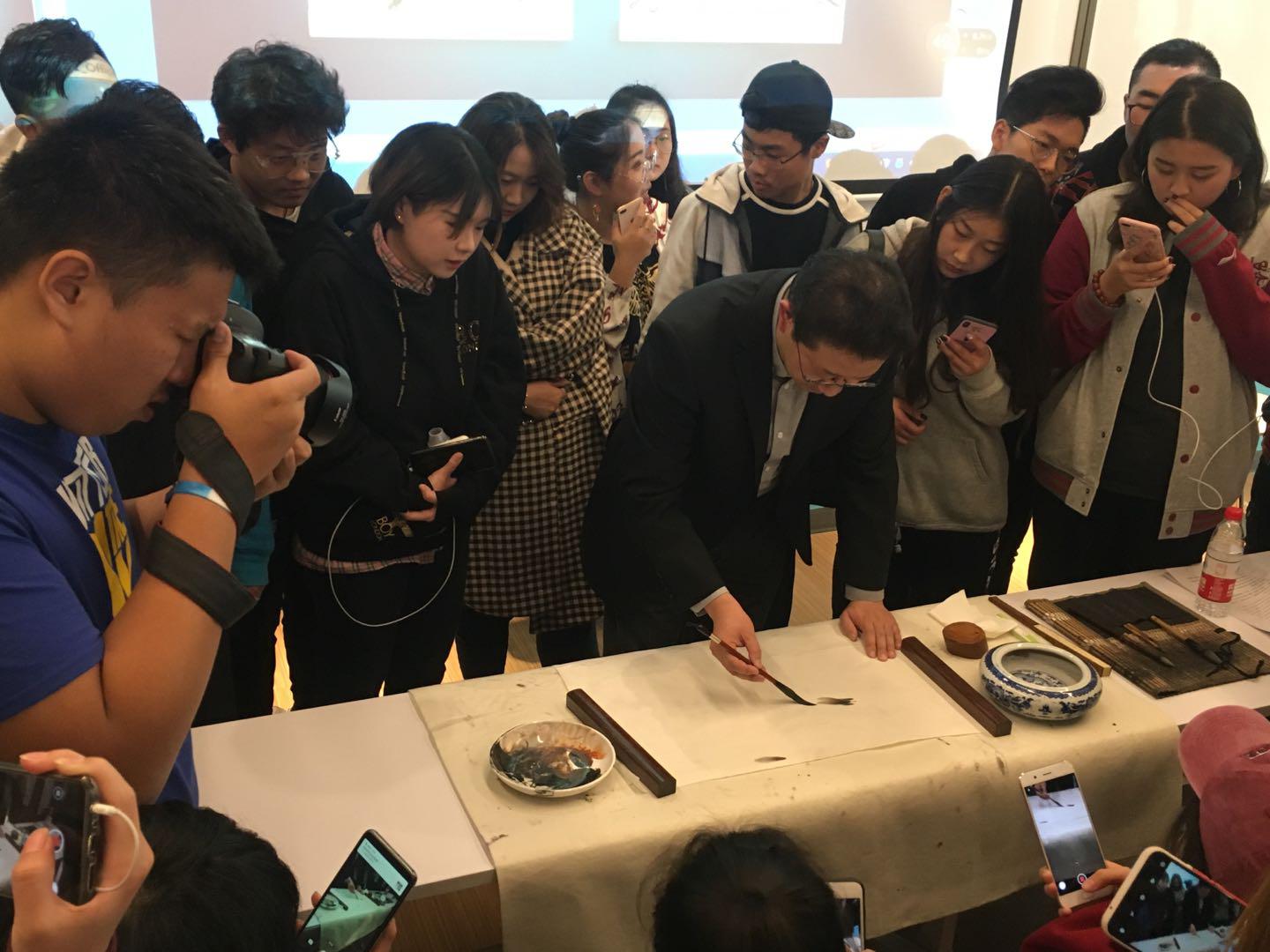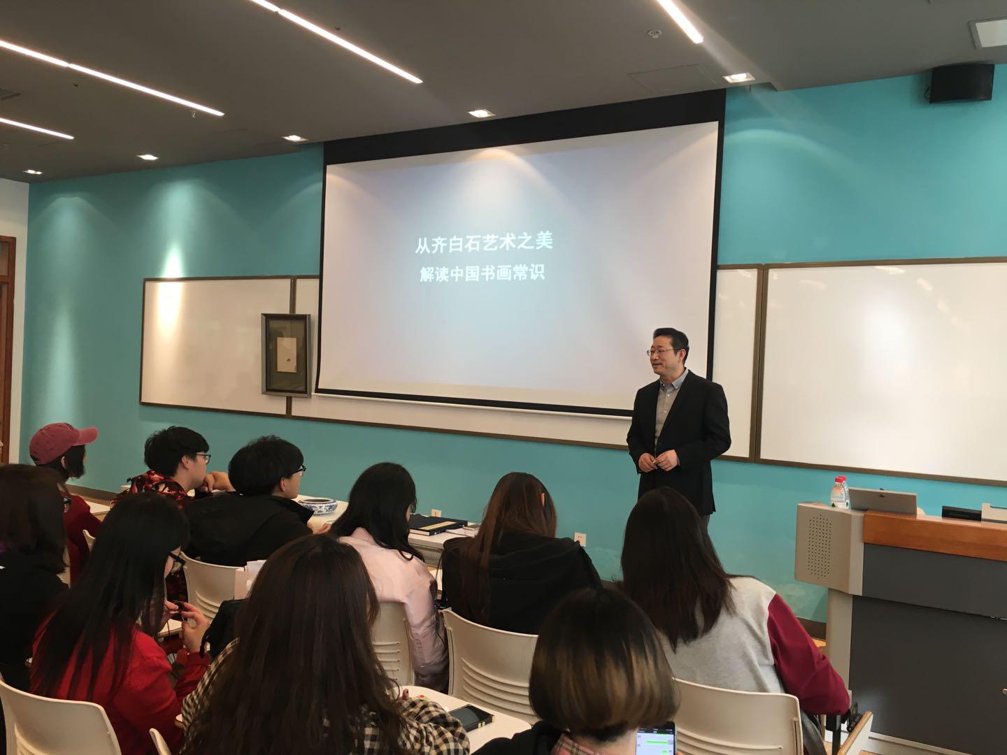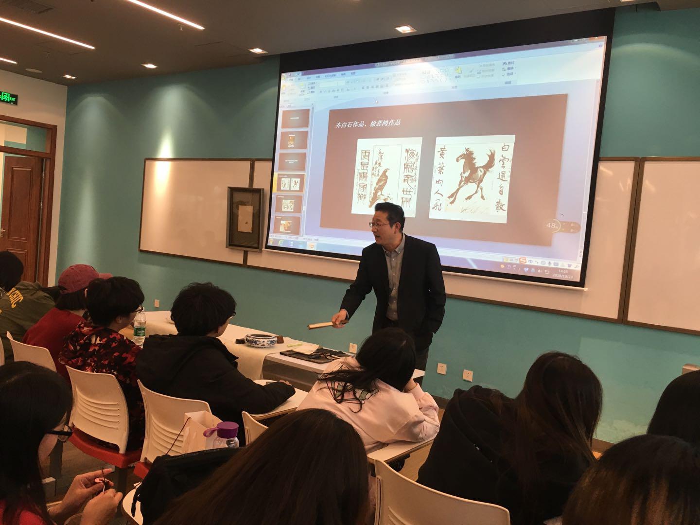 2018年10月23日,齐白石再传弟子、娄师白先生入室弟子、中国美术家协会会员、北京东城区美术家协会副主席、北京扇子艺术协会副会长、北京工商大学嘉华学院客座教授李海峰携一幅齐白石工笔草虫真迹,为艺术与传媒学院的同学们进行一场别开生面的讲座,受到学生追捧。