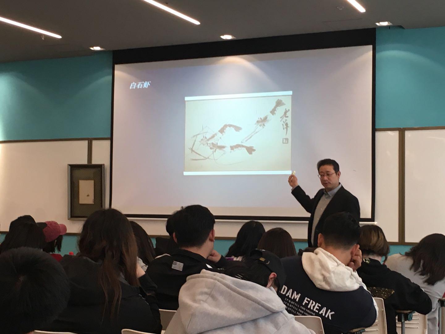 讲座结束后,同学们仍然意犹未尽,在同学们的要求下,李老师现场演了齐派经典——游虾。墨色深浅浓淡,寥寥数笔,一只虾振臂游弋水中,活灵活现。画毕,赢得同学们热烈的掌声。